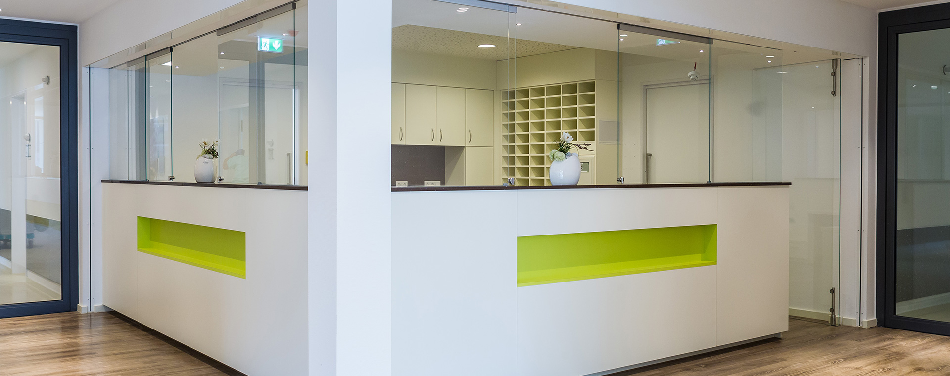 In intensiver Zusammenarbeit mit der Stationsleitung, Projektmanagement und technischer Abteilung entstanden Räume mit hoher Aufenthaltsqualität. Neutrale Wand- und Schrankflächen wechseln sich ab mit der Akzentfarbe grün und in Kombination mit der Holzbodenoptik entsteht so eine Stimmung der Ruhe und Gelassenheit.