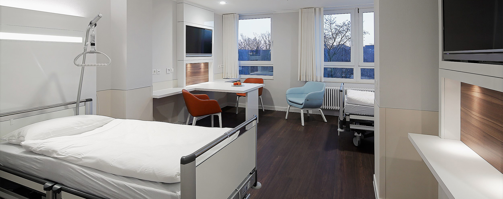 „Wir nahmen frühzeitig das Gespräch mit Gesing Objekteinrichtungen auf, um die Umsetzbarkeit unserer Vorstellungen zu prüfen und um eine verlässliche Kostenvorschau zu erhalten. Die Idee, Tischklappen einzusetzen die sanft und ausbalanciert öffnen überzeugte uns, zumal diese Konstruktion seit Jahren ausgereift ist und auch in anderen Krankenhäusern bereits im Einsatz ist. Ebenso erfolgte bereits in früher Projektphase die Unterstützung durch das Planungsteam von Gesing, das uns durch Ideen, Entwürfe und Visualisierungen des Patientenzimmers und der Lounge bei dem finalen Entscheidungsprozess unterstützte und erlebbar machte. Es war der wesentliche Unterschied, mit einem Klinik-Spezialisten dieses Projekt zu realisieren, der jahrzehntelange Erfahrung im Ausbau von Krankenhäusern hat und die Funktional- und Hygieneanforderung kennt.